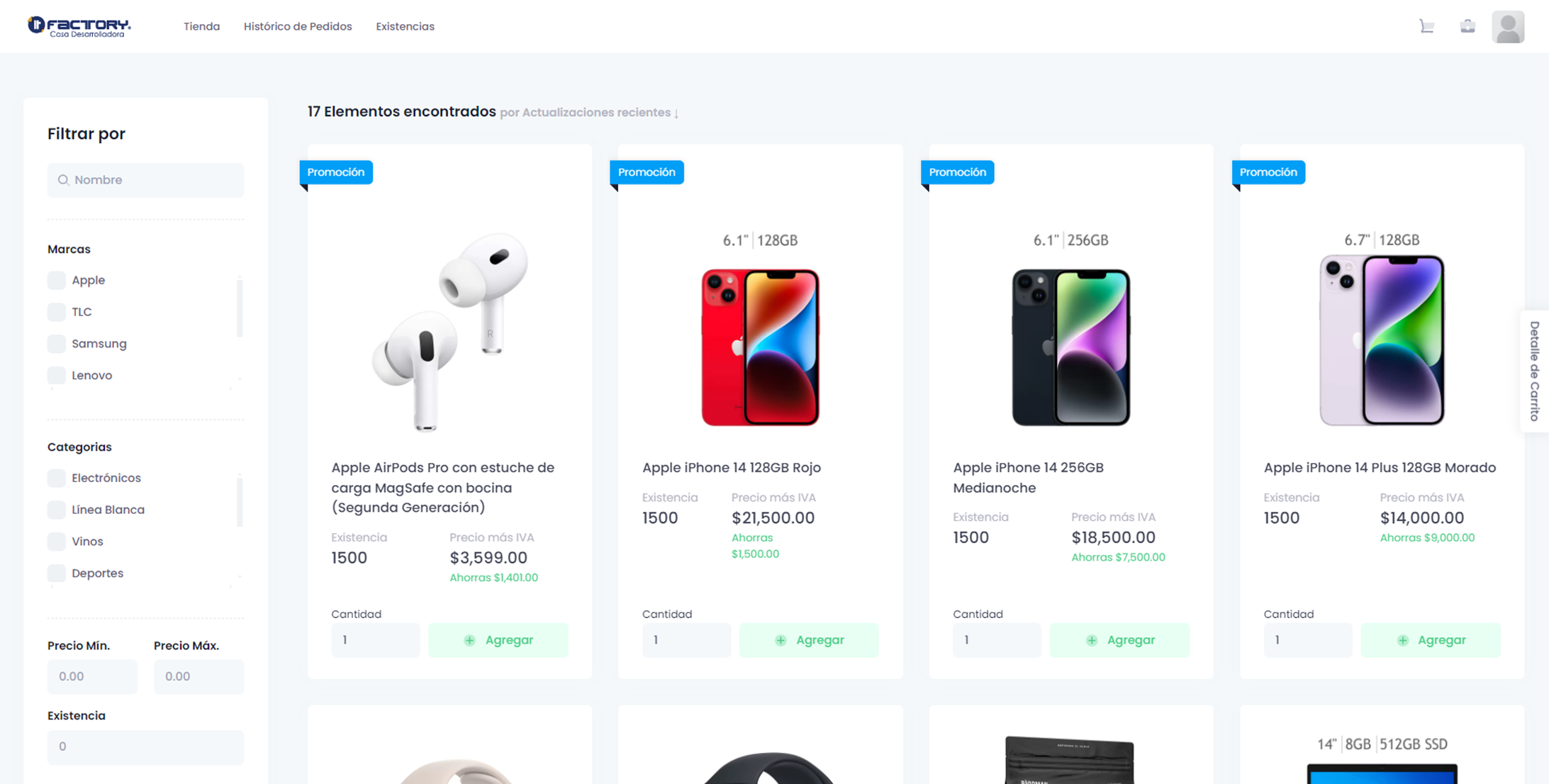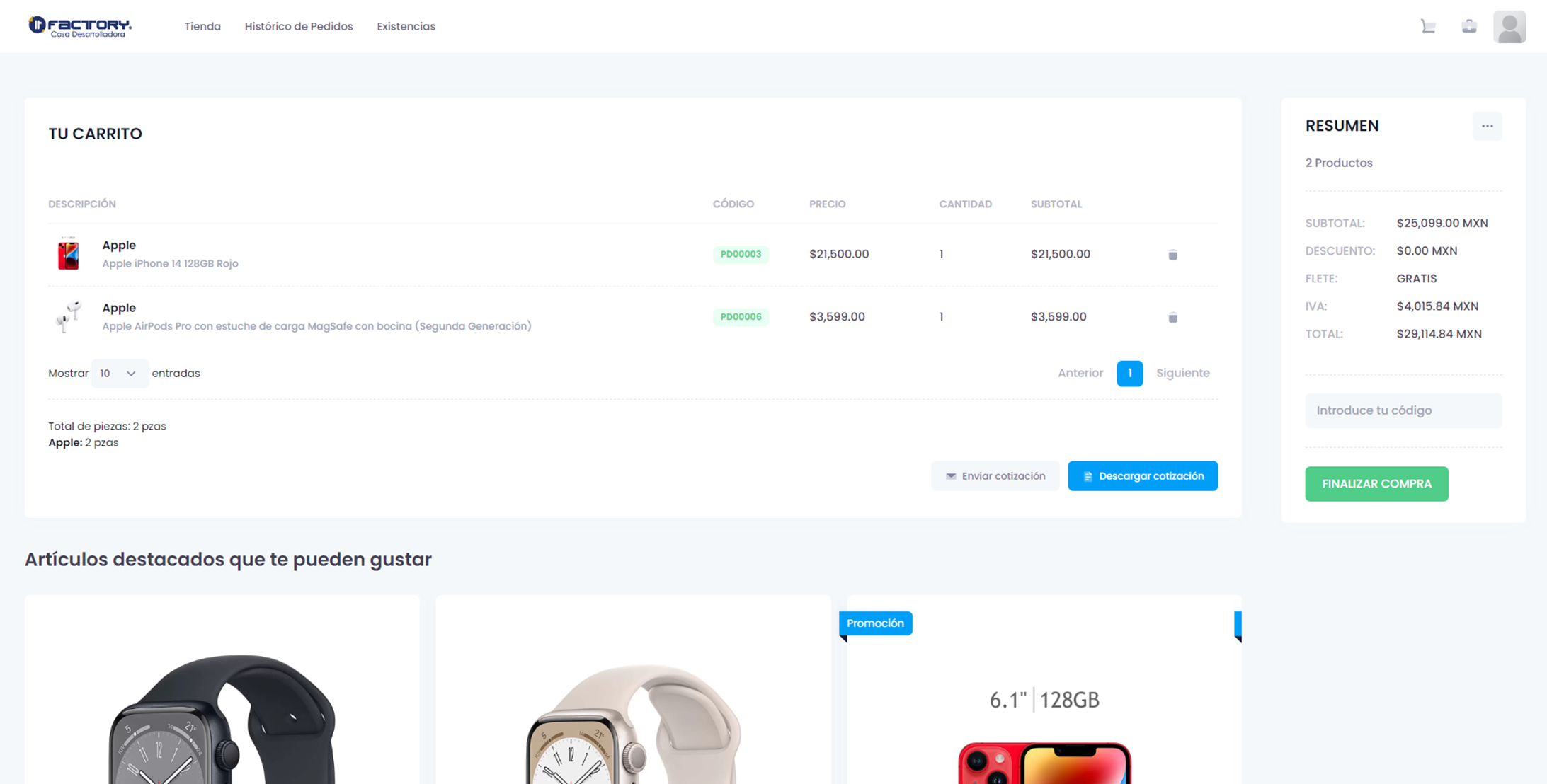 Carrito de compras y flujo de pedido tipo ecommerce.