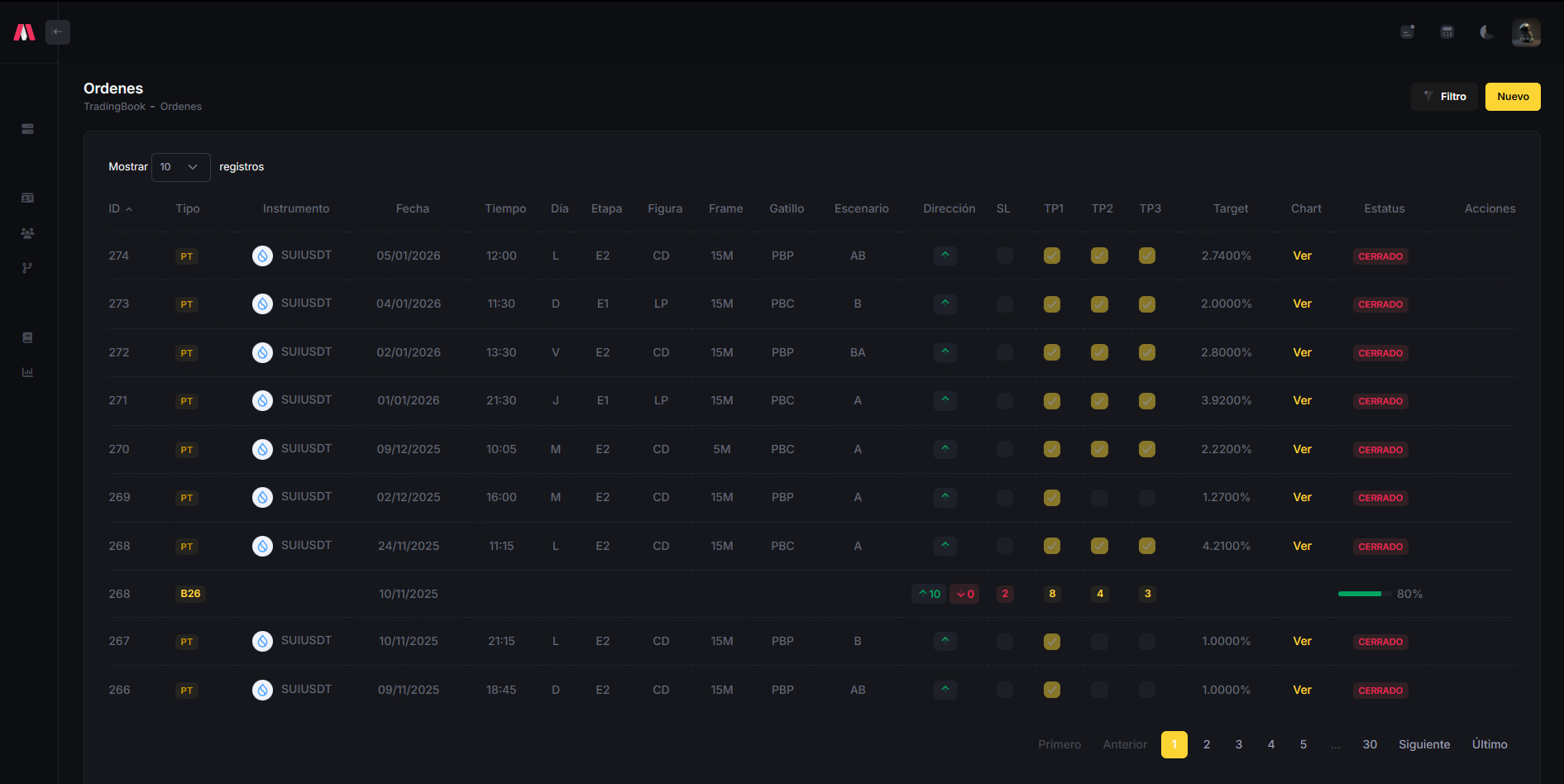 TradingBook es una plataforma web orientada al análisis de performance en trading de criptomonedas. Centraliza el registro de operaciones y transforma datos operativos en métricas accionables para evaluar consistencia, detectar patrones y mejorar la toma de decisiones. Fue desarrollado con .NET 8 y Clean Architecture, con enfoque en escalabilidad, mantenibilidad y analítica de negocio.