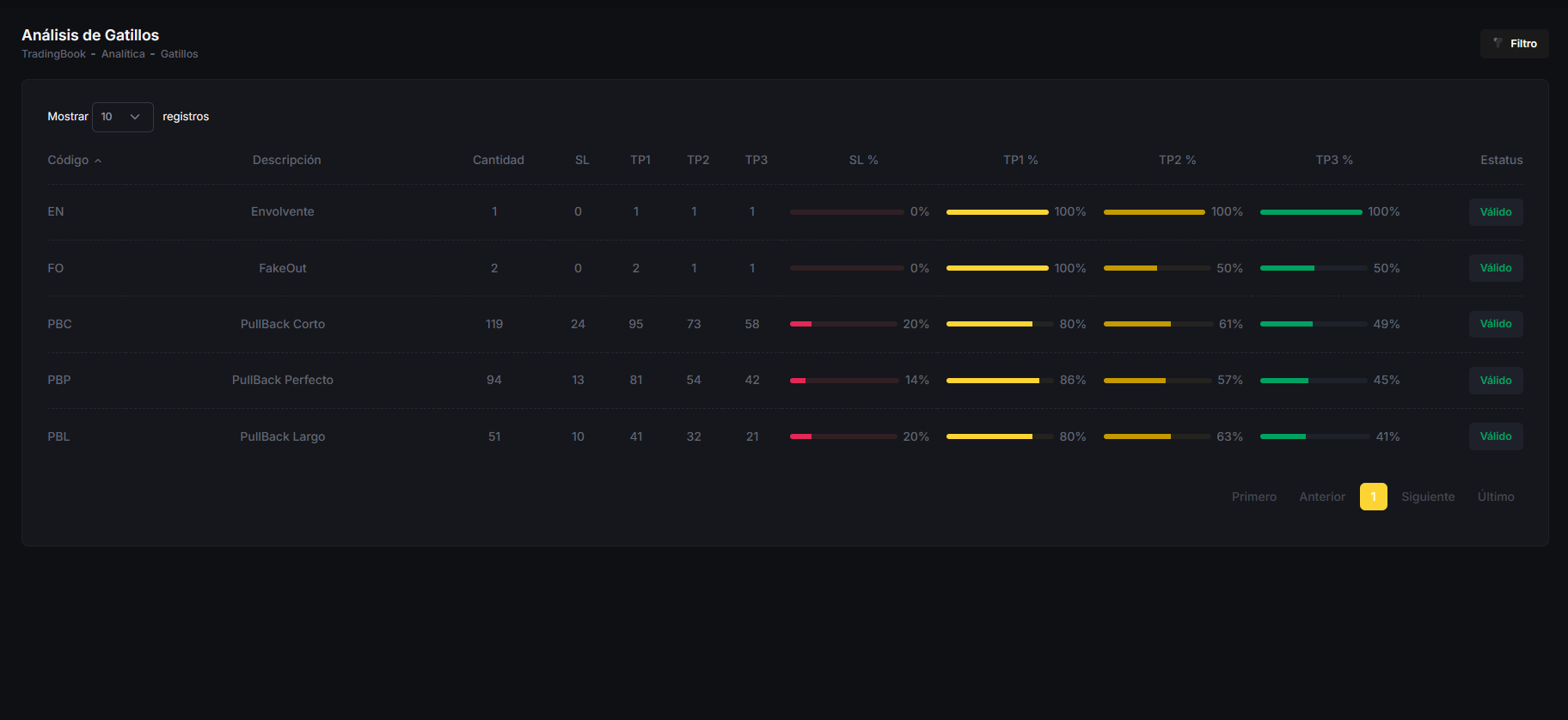 Análisis de setups mediante evaluación por SL, TP1, TP2 y TP3.