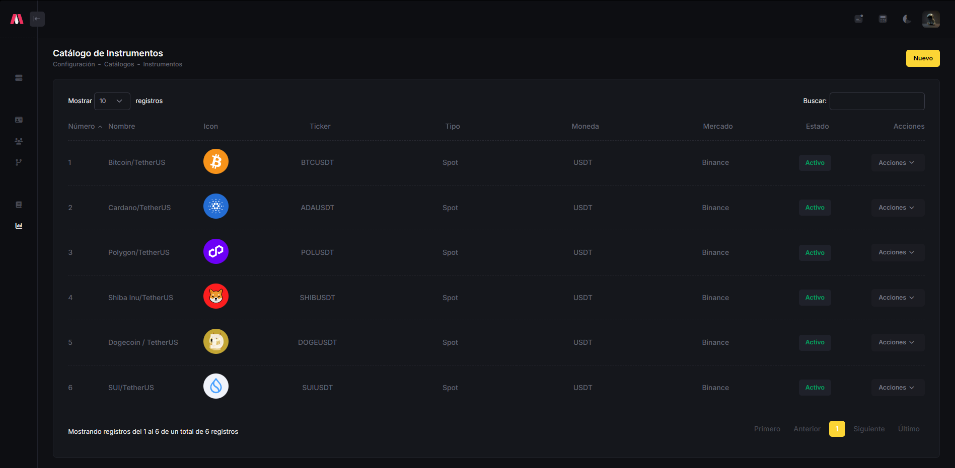 Registro detallado de operaciones con instrumento, temporalidad, dirección y resultado.